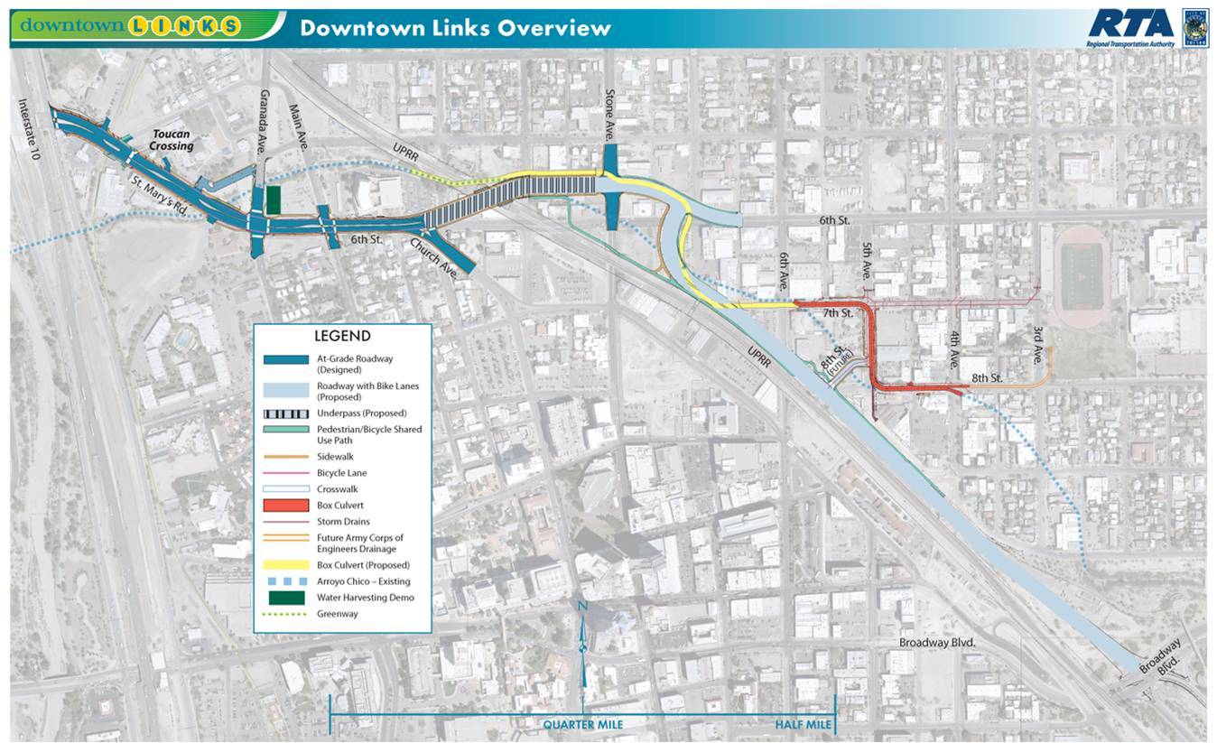 A brief project overview first: Phases 3 and 4 of Downtown Links basically include a new roadway connecting the north end of Barraza-Aviation Parkway from Broadway up to 6th Street and then west, under the Union Pacific Railroad, to the soon to be widened St. Mary’s Road (see map). A multi-use path and land use planning are also included.