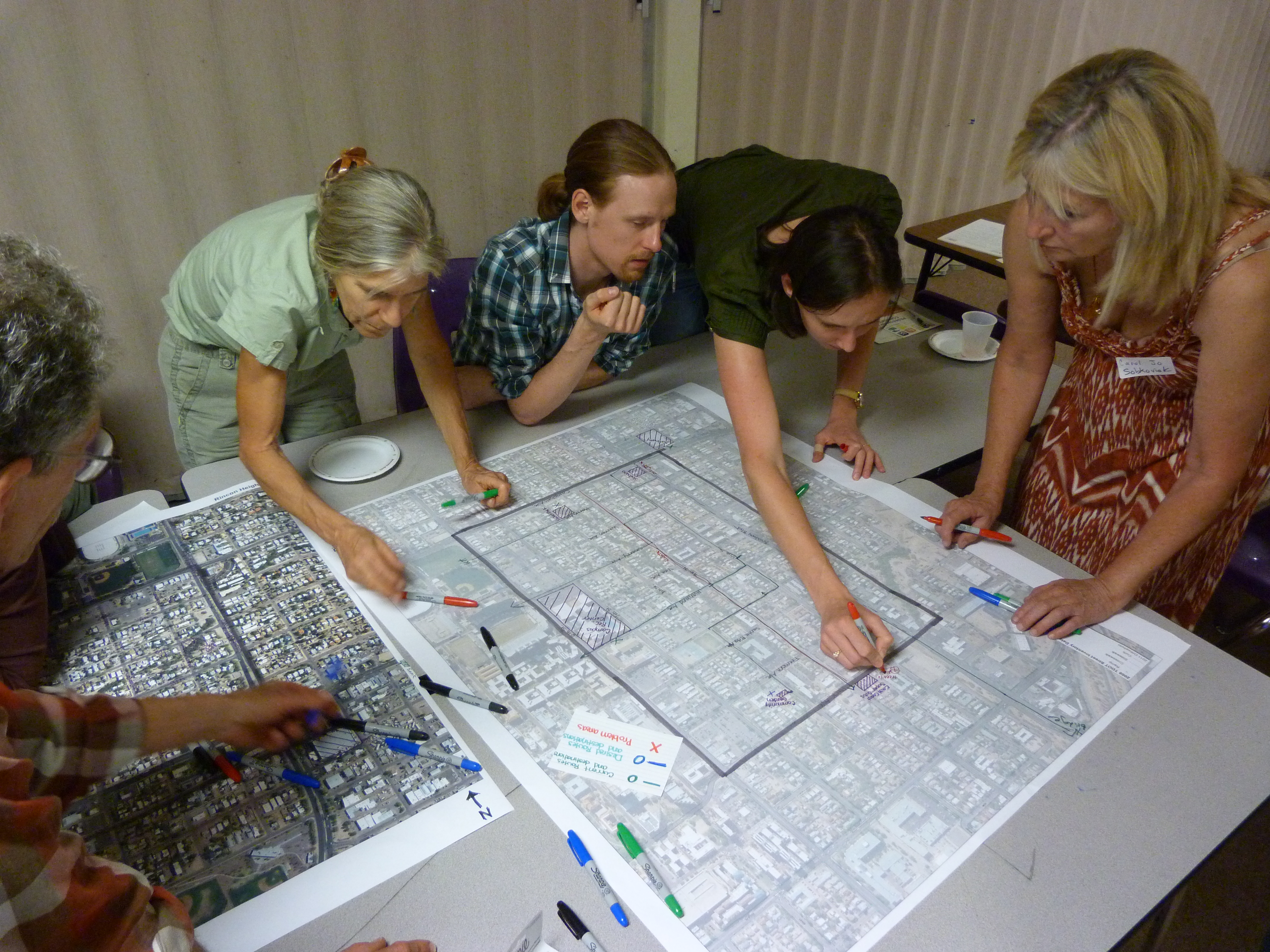The Rincon Heights Neighborhood Walking Workshop started with an orientation from Emily Yetman, LSA Executive Director, and Jessica Hersh-Ballering, a graduate student in University of Arizona College of Public Health and an intern with LSA who is leading the effort to develop the pilot Walking Workshop survey and mapping protocol. At the meeting, residents mapped out their common destinations and the routes they typically take to get there, places they would like to walk to, as well as problem areas in the neighborhood.