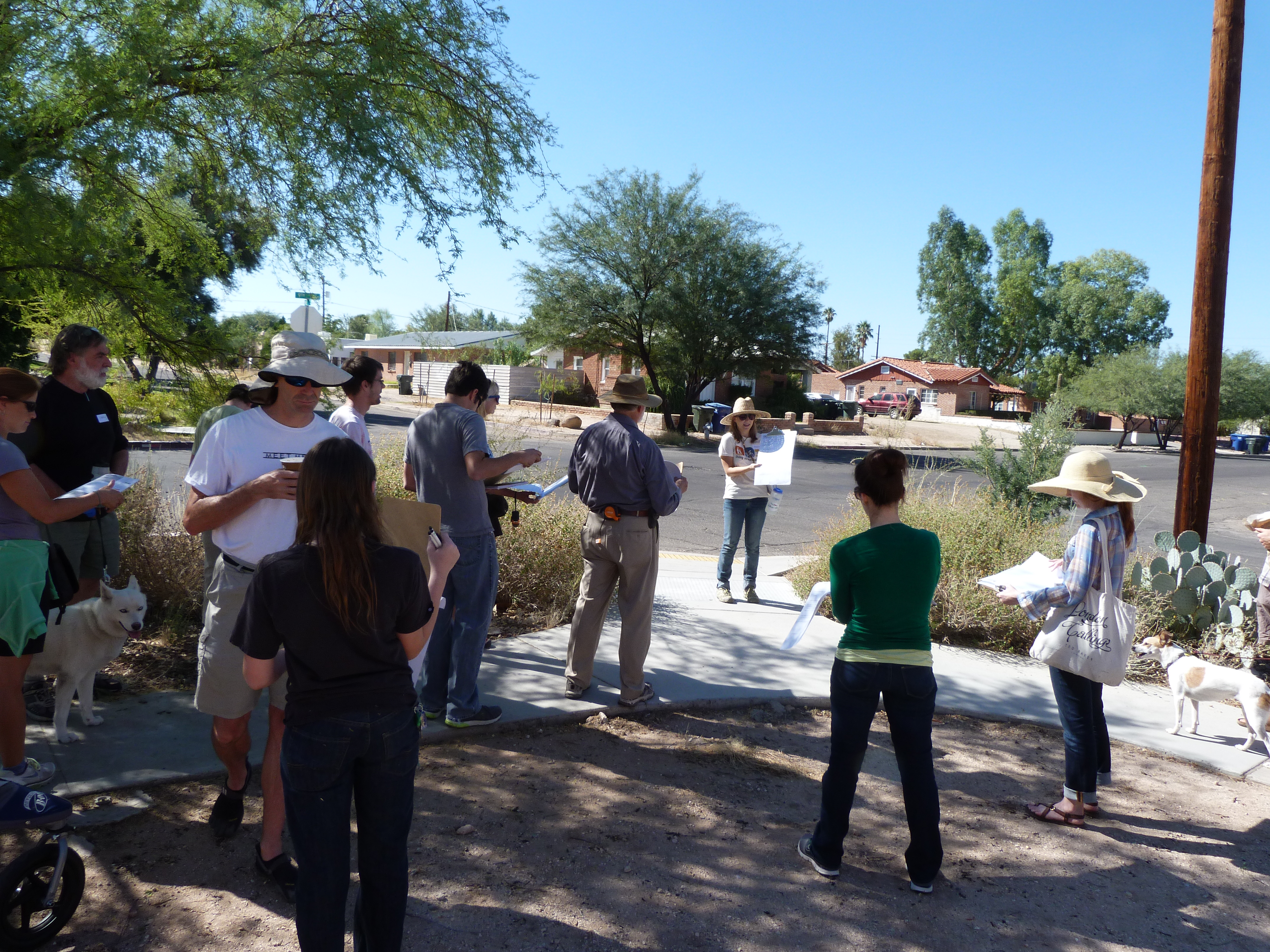 In response to these challenges, Living Streets Alliance (LSA) has launched a Pedestrian Safety and Comfort Campaign with the goal of making walking safe and comfortable in the Greater Tucson Region. Last week, LSA began implemented part of the campaign with the first of three pilot Neighborhood Walking Workshops (a type of audit of walking conditions) in the Rincon Heights Neighborhood, ranked by Walk Score as the 14th most walkable neighborhood in Tucson. Despite a relatively good walk score (72-Very Walkable: most errands can be accomplished by foot), Rincon Heights also suffers from some common deficiencies of older urban neighborhoods, such as missing sidewalks and wheelchair-accessible ramps.