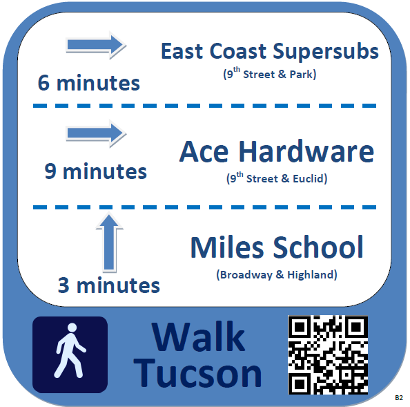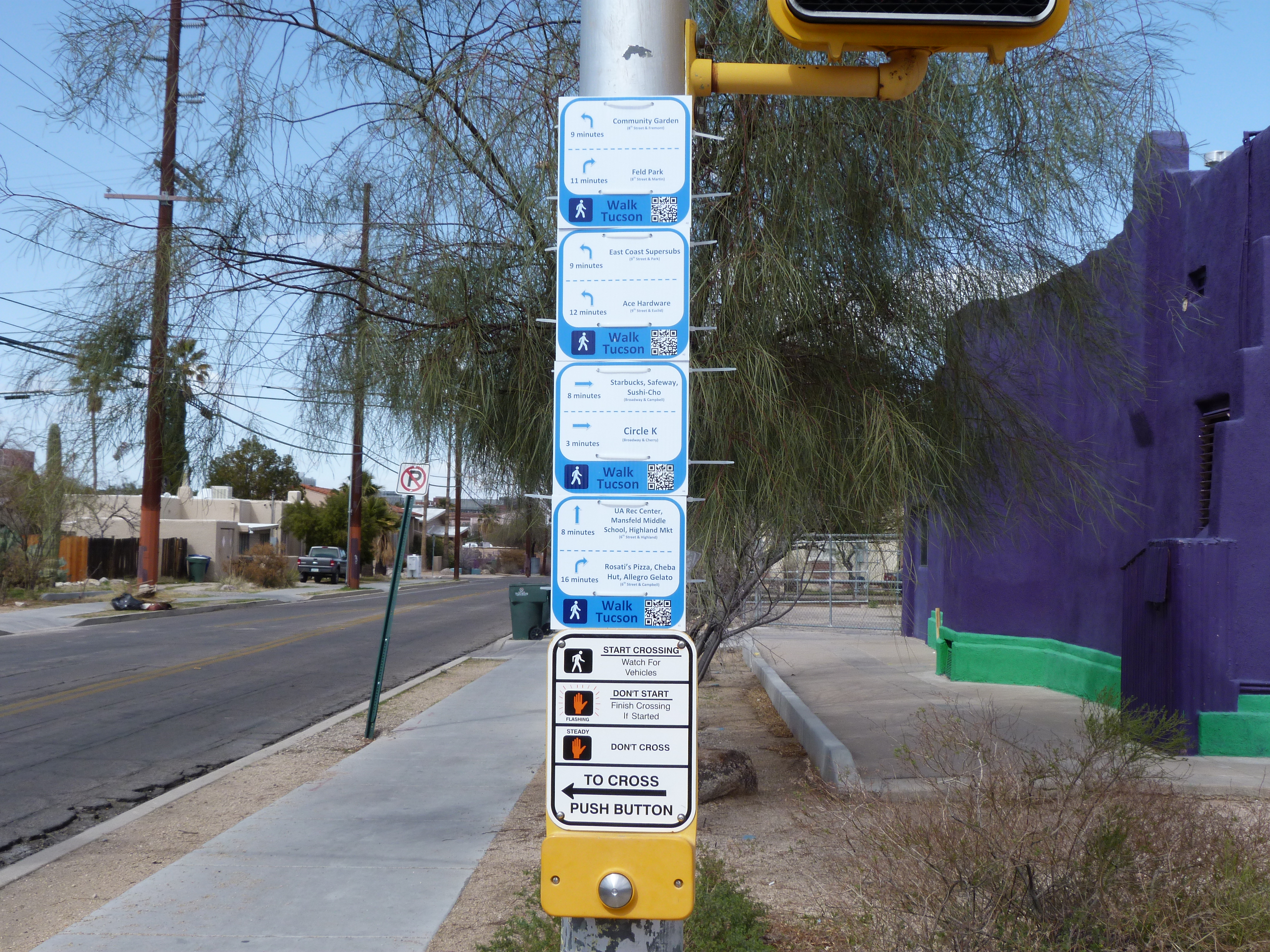 So when I read about a group that installed simple pedestrian wayfinding signs in downtown Raleigh, NC I was excited about how we might be able to replicate it here in Tucson. This type of project fit perfectly with ongoing efforts in my neighborhood, Rincon Heights, to promote walking and cycling as transportation options. I also had a bit of a head start with the destinations identified during the Walking Workshop held in my neighborhood last October.